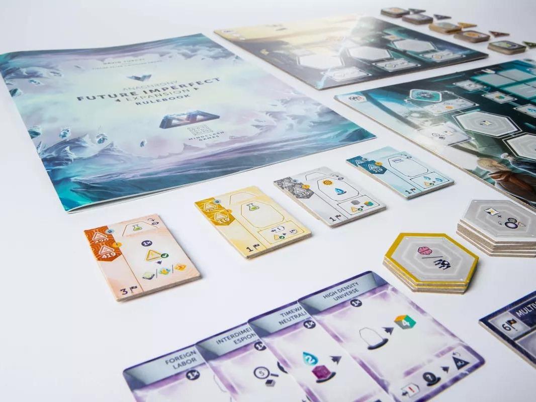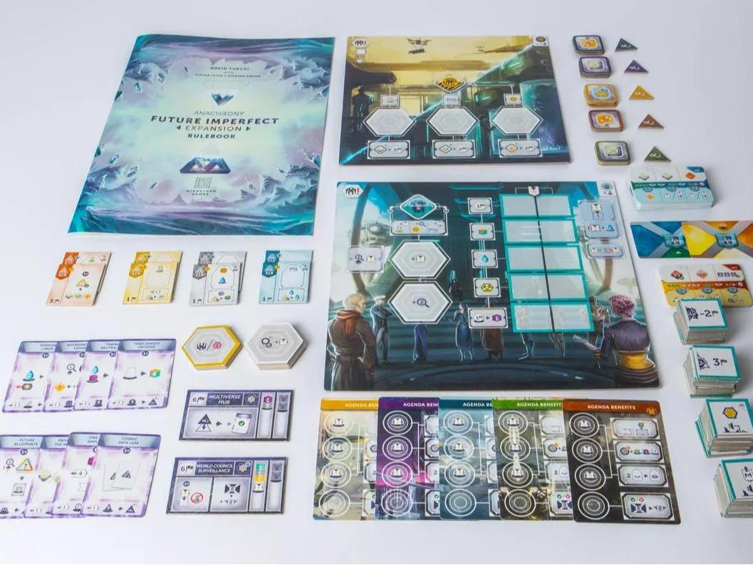 Future Imperfect is a modular expansion for Anachrony, with four new modules expanding the possibilities beyond new horizons. These modules are playable on their own, but they are also compatible with each other and most past and future Anachrony modules and expansions. Neutronide Buildings offers a set of 4 new buildings that become increasingly effective the more Power Plants you have. The Hypersync module allows you to perform a Capital action without actually placing an Exosuit, then in the future use the new Hypersync Action to make your placement affect the past. This puts serious strain on the space-time continuum, increasing the risk of Paradoxes, but often the risk is worth the reward and the flexibility. This module is supported for 1-4 players (Fractures of Time expansion required for solo play.) With the Quantum Loops module, you are no longer limited to warping from your own timeline: the module opens up parallel universes where resources are more plentiful, the locals are eager to join your cause, or their technology allows you to shortcut your own travels through time… The possibilities multiply through a new Warp tile that grants access to the powerful Quantum Effect cards, but beware – to close a loop to a parallel universe, you will need a real Breakthrough… This module is supported for 1-4 players (Fractures of Time expansion required for solo play.) The Intrigues of the Council module simulates the World Council’s political machinations, bringing two new aspects to the game: another layer of player interaction and customizable endgame scoring objectives, influenced by the players. By sending Exosuits to the right place at the right time, players can receive bonus resources and compete to build a tableau of Agenda tiles, which replaces the base game’s Endgame Condition scoring. This module is recommended for 3 or 4