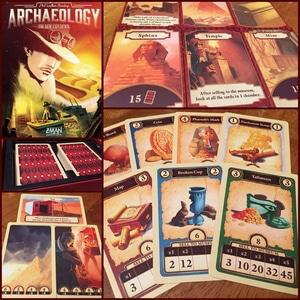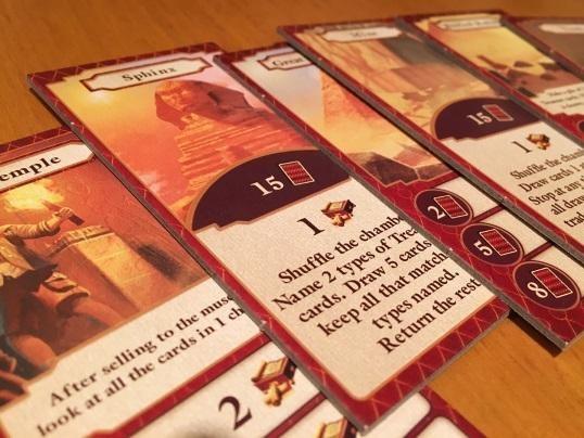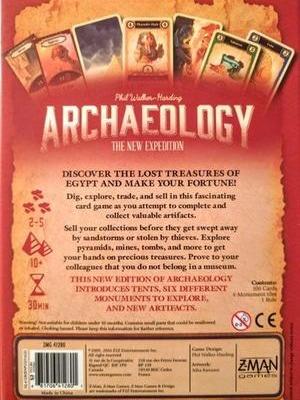 Archaeology: The New Expedition is a reimplementation of the popular Archaeology: The Card Game (with several changes). You are an archaeologist working the dig sites of the Egyptian desert. Search for the right pieces to complete torn parchments, broken pots, and other priceless artifacts. Explore an ancient pyramid in the hope of uncovering a huge stash of treasure! Trade shrewdly at the local marketplace to increase the value of your collection. Sell your treasures to the museum at just the right time for maximum profit. But beware, the desert also has its dangers! A devastating sandstorm can throw your expedition into disarray, and cunning thieves lurk around the dig site ready to steal your prize discovery! In Archaeology: The New Expedition, you want to find treasures and make the most money possible by selling them to the museum. Players start with four treasure cards in hand; one monument tile is chosen at random, then the chambers of the monument are loaded secretly with treasure cards.