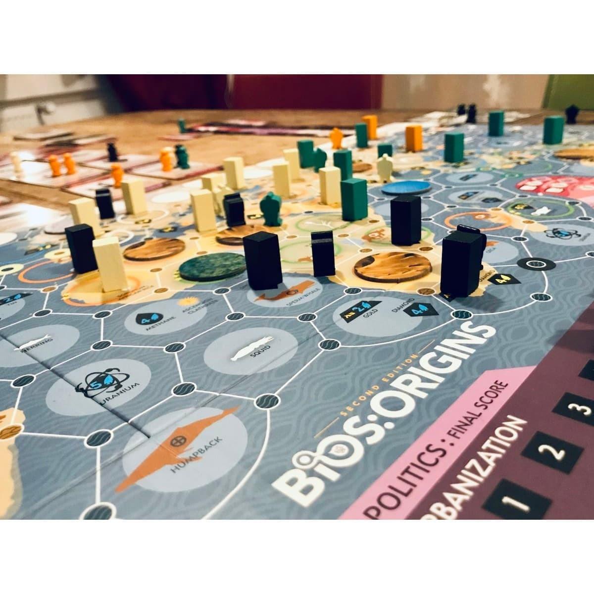 The game integrates with Bios: Genesis and Bios: Megafauna, so that you can start as a variety of intelligent but not-quite lingual marine or terrestrial creatures. Two maps and 26 hex chits are included, to accommodate variable landforms and cratons on habitable Earth, Mars, or Venus. Solitaire and cooperative variants are included.