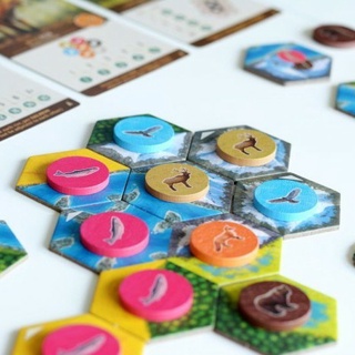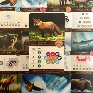 Ideally you can place habitat tiles to create matching terrain that reduces fragmentation and creates wildlife corridors, mostly because you score for the largest area of each type of habitat at game’s end, with a bonus if your group is larger than each other player’s. At the same time, you want to place wildlife tokens so that you can maximize the number of points scored by them, with the wildlife goals being determined at random by one of the three scoring cards for each type of wildlife. Maybe hawks want to be separate from other hawks, while foxes want lots of different animals surrounding them and bears want to be in pairs. Can you make it happen?