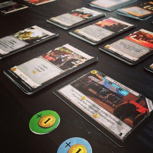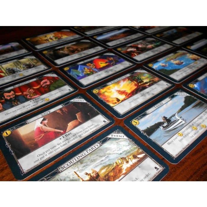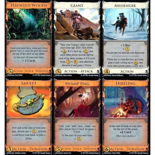 Life is either a daring adventure or nothing. You’re not sure which, but at least you’ve narrowed it down. You are rich with life experiences, but have had trouble trading them for goods and services. It’s time to seek your fortune, or anyone’s really whoever’s is closest. To the west there’s a land of milk and honey, full of giant bees and monstrous cows; to the east, a land of eggs and licorice; to the north, treacherous swamps; to the south, loyal jungles. But all of them have been thoroughly pillaged. You’ve heard legends, though, of a fifth direction as yet unspoiled, with its treasures conveniently gathered into troves. You have your sword and your trail mix, handed down from your father, and his father before him. You’ve recruited some recruits and hired some hirelings; you’ve shined your armor and distressed a damsel. You put up a sign saying “Gone Adventuring”. Then you put up another sign, saying “Beware of Dog”, in case people get any ideas. You’re ready. You saddle up your trusty steed, and head florst. Dominion: Adventures, the ninth addition to the game of Dominion, contains 400 cards, 60 tokens and six mats. This expansion has 30 new Kingdom cards, including the return of Duration cards that do things on future turns, plus Reserve cards that can be saved for the right moment. There are also 20 Event cards that give you something to buy besides cards, including tokens that modify cards.