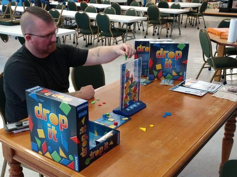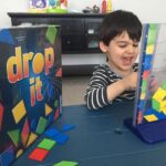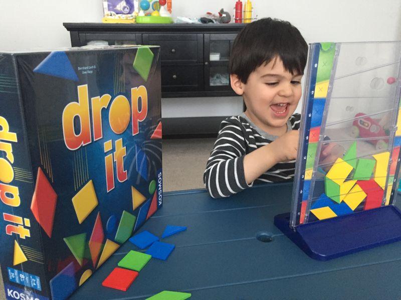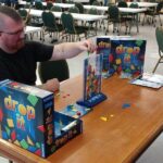 Circles, triangles, squares and diamonds: Drop It is about letting go, with the pieces you drop landing somewhere in the vertical game board, ideally where they’ll score the most points, but the tiles bounce around and don’t always land where you expect them to! In more detail, each turn the active player drops one of their pieces into the slot of the game board. The player scores points for the highest level that the piece touches and for any special locations that it touches, but if the piece touches anything of the same shape or color, then you score nothing! What’s more, certain pieces are forbidden at certain spots on the edge of the playing area. The Drop It rulebook includes variant rules for simpler play or more variety from game to game.