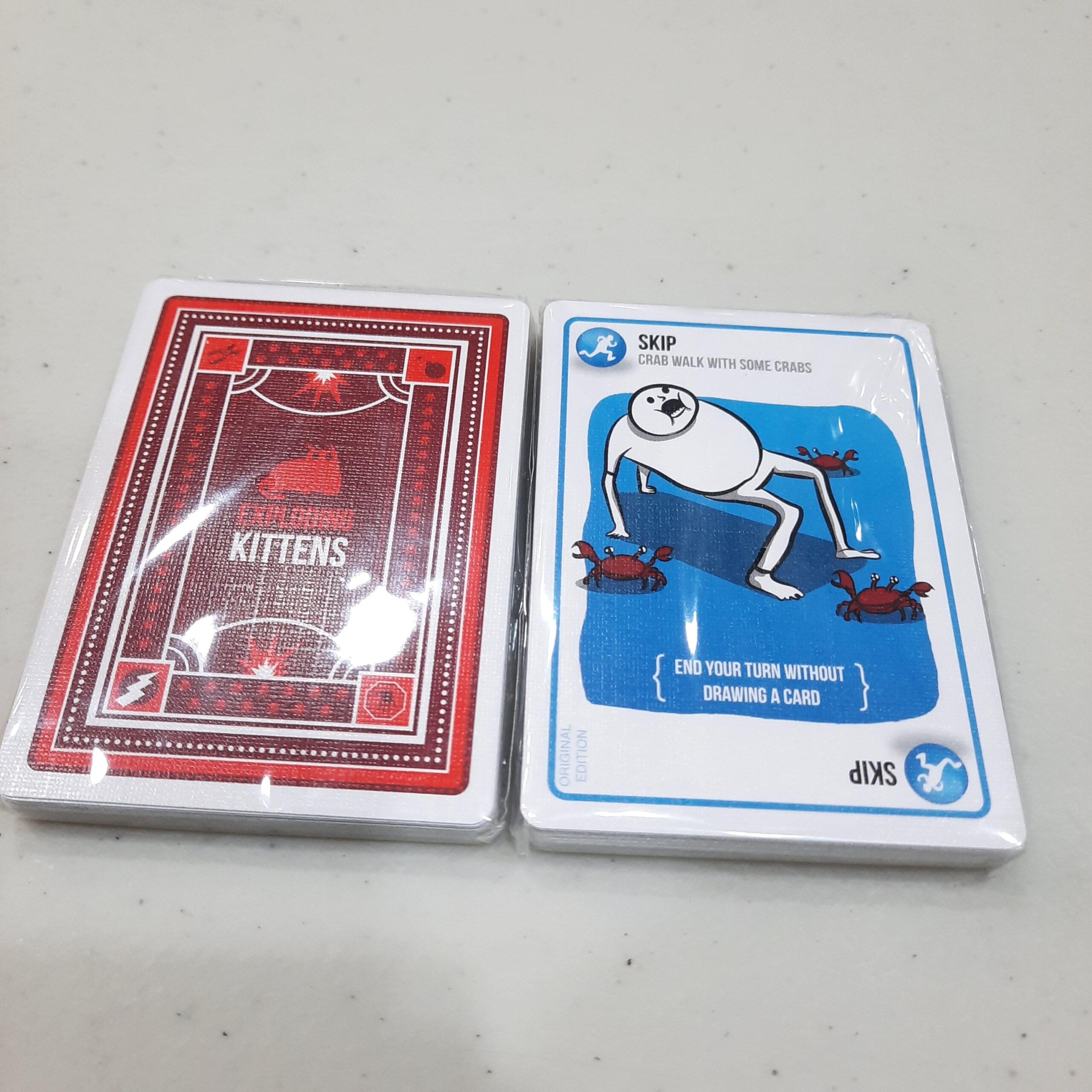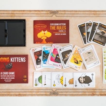 Exploding Kittens is a kitty-powered version of Russian Roulette. Players take turns drawing cards until someone draws an exploding kitten and loses the game. The deck is made up of cards that let you avoid exploding by peeking at cards before you draw, forcing your opponent to draw multiple cards, or shuffling the deck.