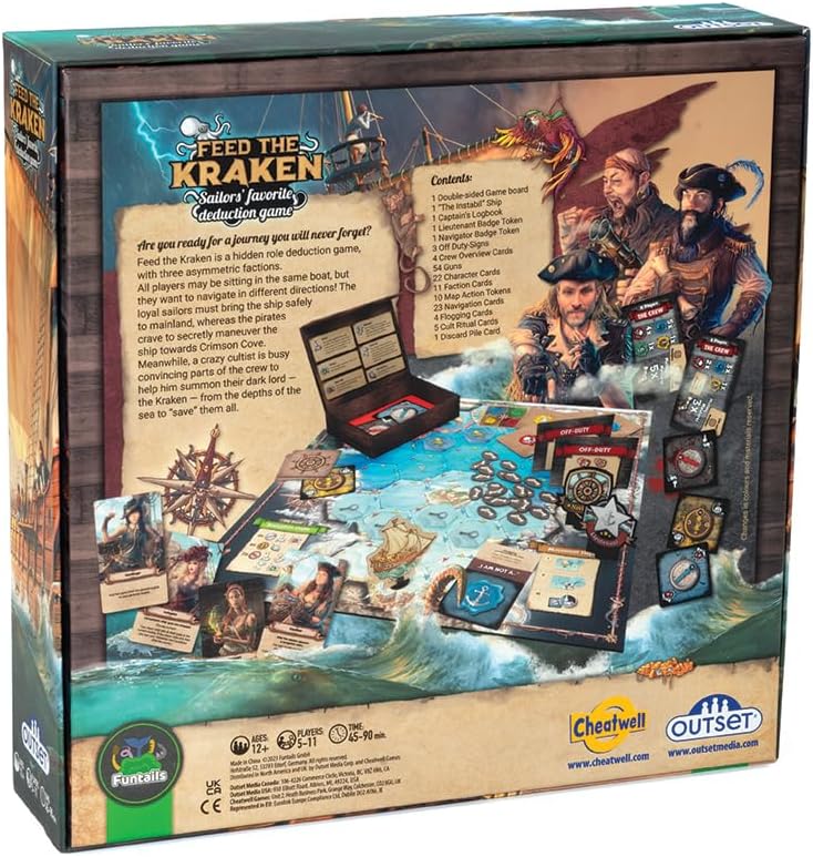 Feed the Kraken is a hidden role deduction game, with three asymmetric factions. All players may be sitting in the same boat, but they want to navigate in different directions! The loyal sailors must bring the ship safely to mainland, whereas the pirates crave to secretly maneuver the ship into the Bermuda Triangle. Meanwhile a crazy cultist is busy convincing parts of the crew to help him summon their dark lord —the Kraken— from the depth of the sea to save them all.
