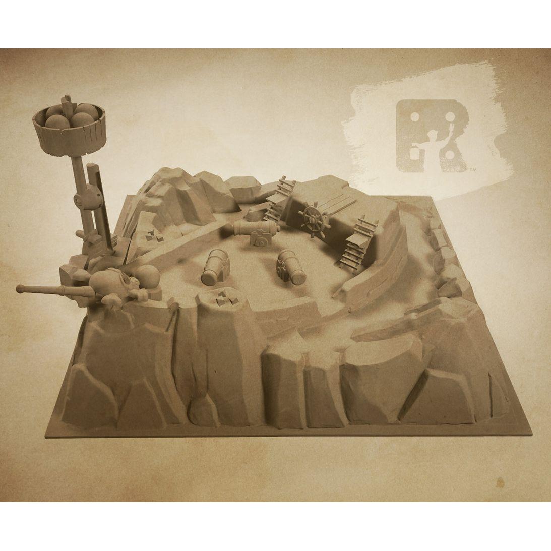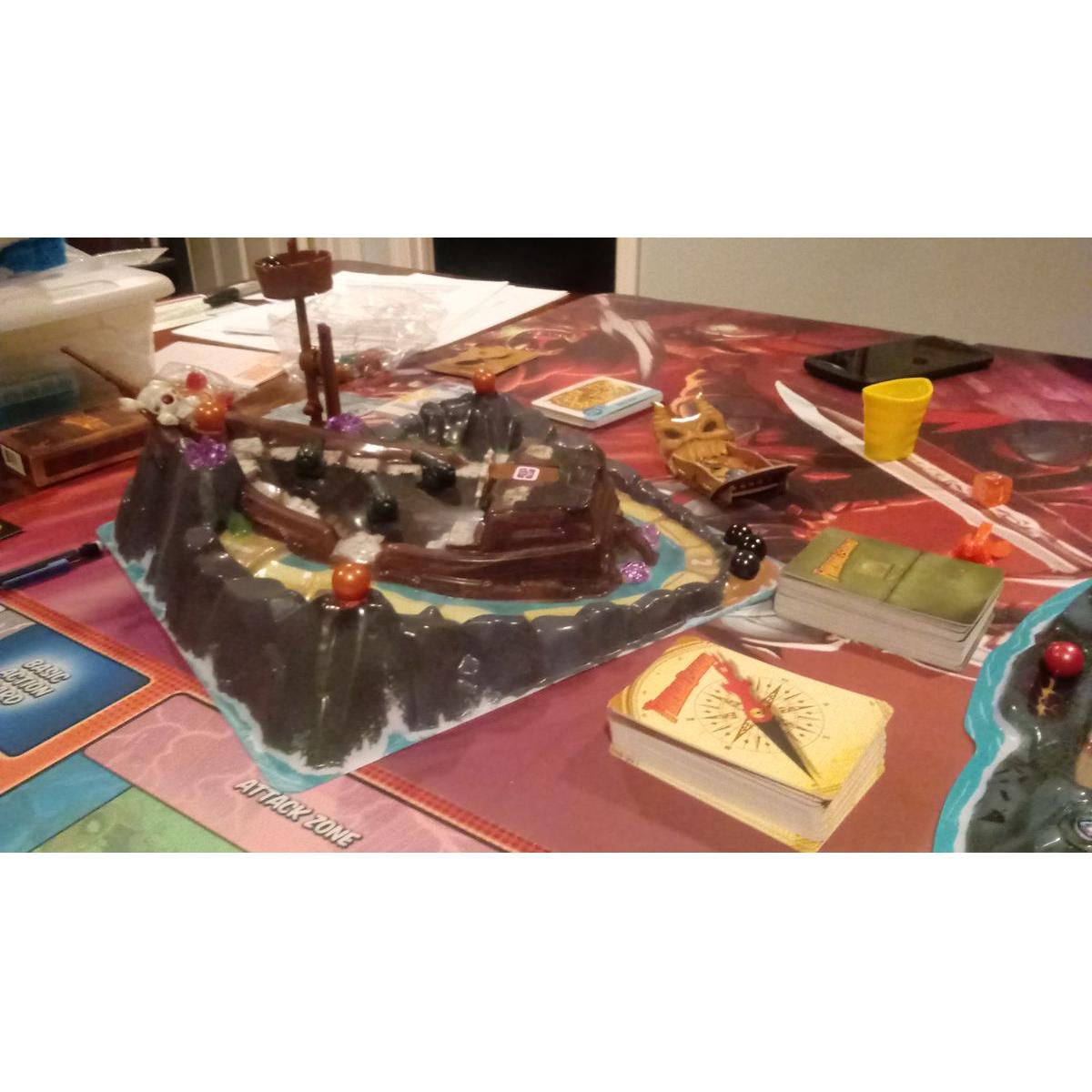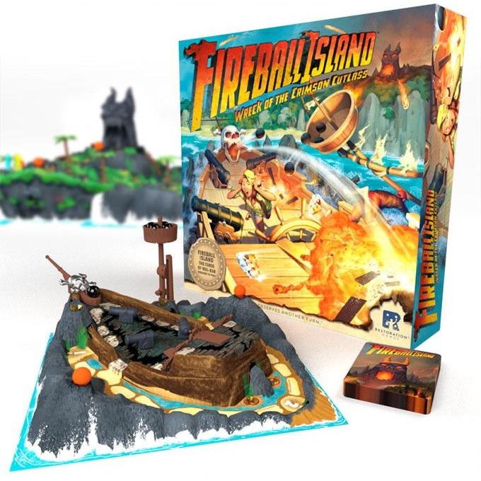 Wreck of the Crimson Cutlass introduces a new play area to Fireball Island: The Curse of Vul-Kar. The ship features new treasures to collect and introduces new action cards with more of a take-that feel. On the ship, you’ll face two new threats. The crow’s nest collect marbles until it suddenly tips over, spilling them all over the deck of the ship. The jolly roger in the bow launches a single marble toward anyone foolish enough to take the captain’s wheel.
