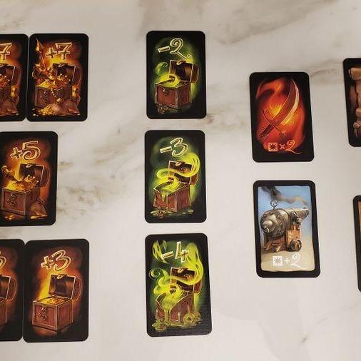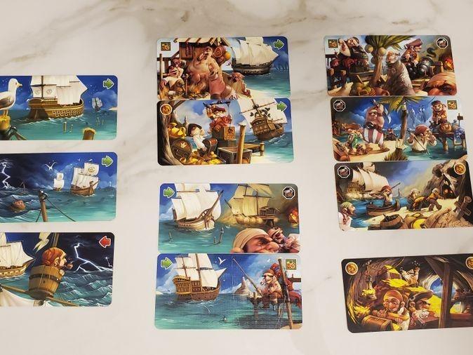 Goal: The game ends on the turn when at least one player’s ship reaches the finish line, completing one circuit around the island of Jamaica. At that point, players are awarded different amounts of gold in accordance with how far away from the finish line they were when the race concluded. This gold is added to any gold a player gathered along the way by detouring from the race to search for valuable treasure, by stealing gold or treasure from other players, or just by loading gold as directed by the cards the player played during the race. The player with the most total gold acquired through all these means is then declared the winner.