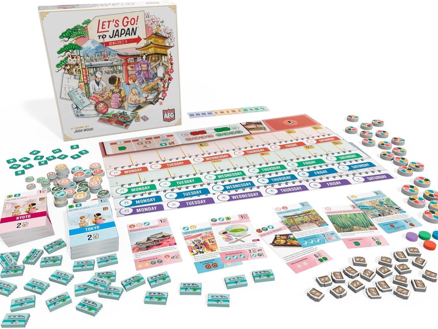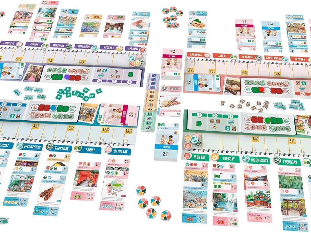 The game consists of thirteen rounds in which players draw activity cards illustrated by Japan-based artists and strategically place them in different days in their week-long itinerary. These can’t-miss tourist attractions will have you bouncing between Tokyo and Kyoto as you try to puzzle out the optimal activities to maximize your experience while balancing your resources. The game ends with a final round in which you ultimately go on your planned trip, activating each of your cards in order along the way.