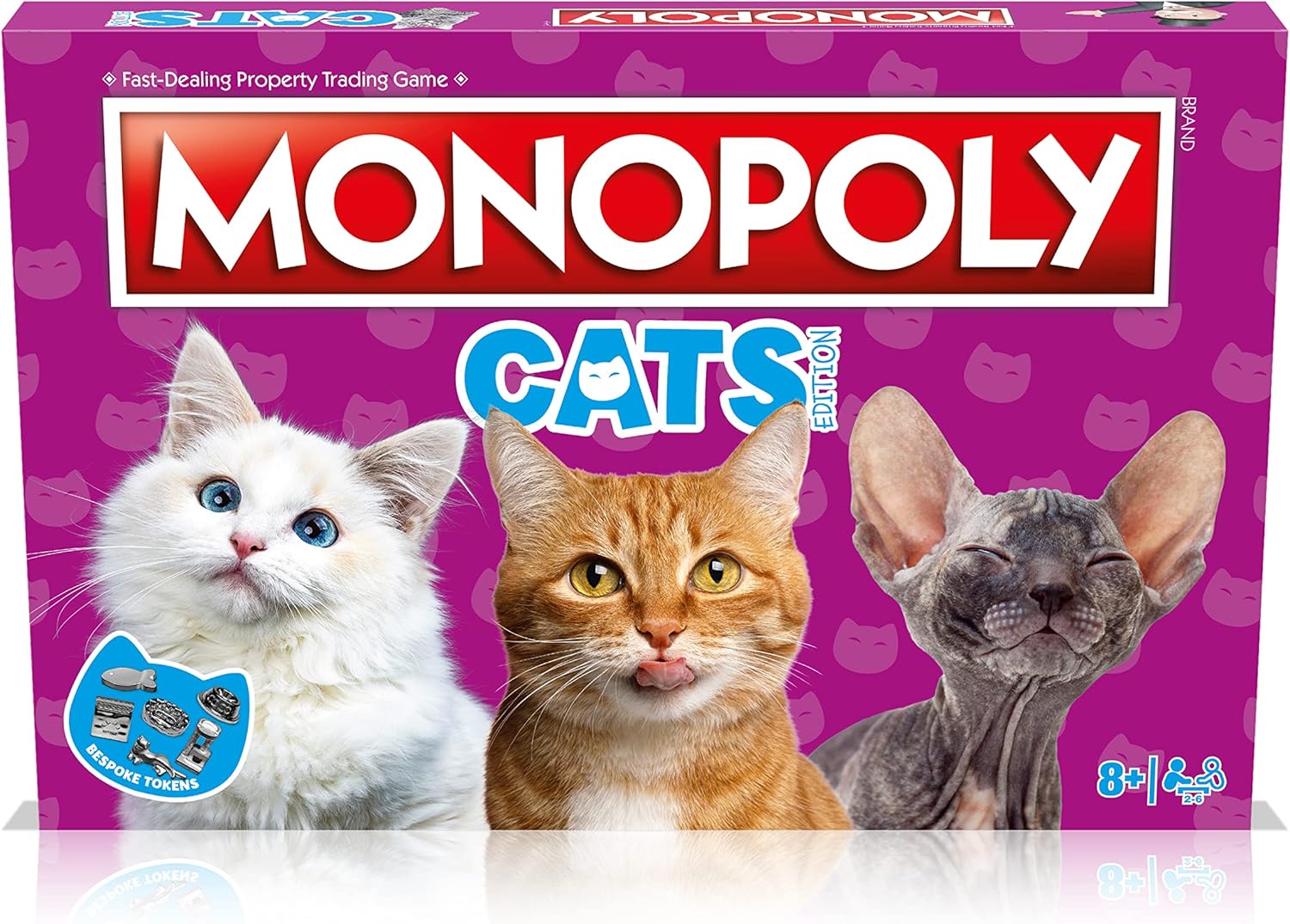 Soft, cuddly, playful and curious, cats make great companions and excellent additions to loving homes. From the instant we welcome them into our lives, cats take complete ownership of our hearts, and also most of our personal things – which we celebrate in this brand new Cats edition of MONOPOLY. Featuring 22 of our cats’ favourite places to nap, play or get into mischief around the home. Take turns choosing your favourite spots, like the kitchen, living room and even the garden. Buy up catteries and family homes to charge your opponents more rent, and pick up Indoor Cat and Outdoor Cat cards for unexpected prizes and penalties. Will you enjoy the company of a fluffy companion while working from home, open up your own cat toy business, or will you end up in jail for forgetting to pick up your choosy kitty’s favourite food? Just watch out for those Kitty Litter and Vet fees! With plenty of favourite places to choose from, will you cat-nap your way to victory on top of a printer, wash up in the kitchen sink, or find a buddy in the cat bed? Roll the dice and try to win Cats MONOPOLY!