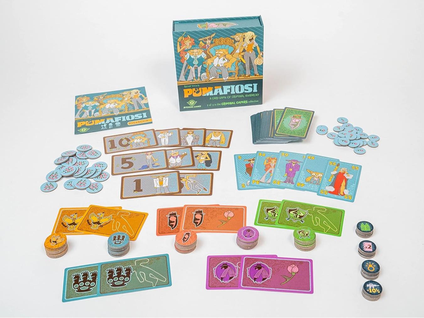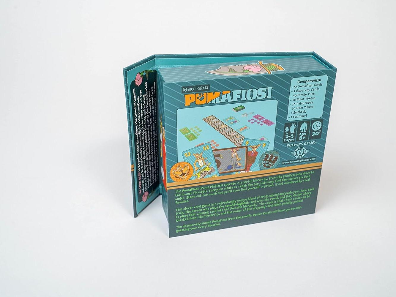 Pumafiosi is a refreshingly unique blend of simple trick-taking and precarious press-your-luck. Each trick, the person who plays the second-highest card wins the round, and they decide where to place that winning card in the hierarchy. You can even choose to place your measly card at the top of the hierarchy to stake your claim on the big boss points. The catch is that these cards can be knocked down one or more steps on the hierarchy by higher-valued cards, and whoever owns a falling card is penalized!