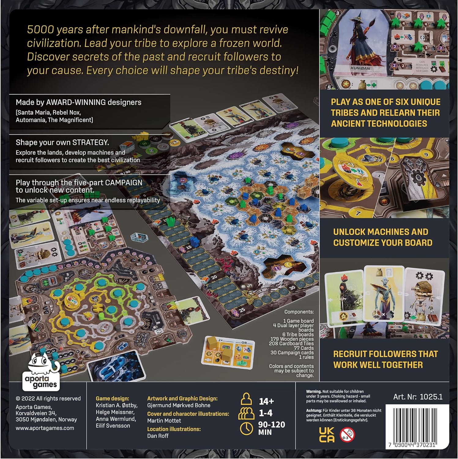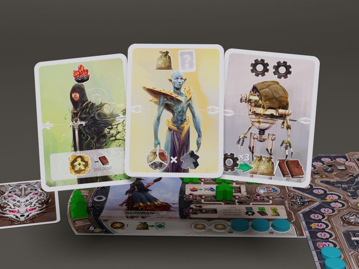 Revive is a game for 1-4 players with asymmetric player powers, highly variable setup, and no fighting or direct conflict. Playing through the 5-part campaign unlocks additional contents, and once all contents have been unlocked, the game can be replayed indefinitely. — At the beginning of the game, each player gets a set of citizen cards, a tribe board, as well as a huge dual-layer player board. The tribe board shows your unique tribe ability and the ancient technologies that you may relearn during the game. The dual-layer player board is where you place your custom machines and upgrade your card slots. A main goal of the game is to reach and populate the large ancient sites. These ancient locations are randomized, and as they are important sources of victory points, they will shape your strategy differently each game. On your turn you take two actions: -Play a card (its effect is determined by which card slot you use) -Explore (reveal an area tile and recruit a new citizen card) -Populate (populate an ancient location to learn a new technology) -Build factory (the adjacent terrains determine which machine tracks you advance)