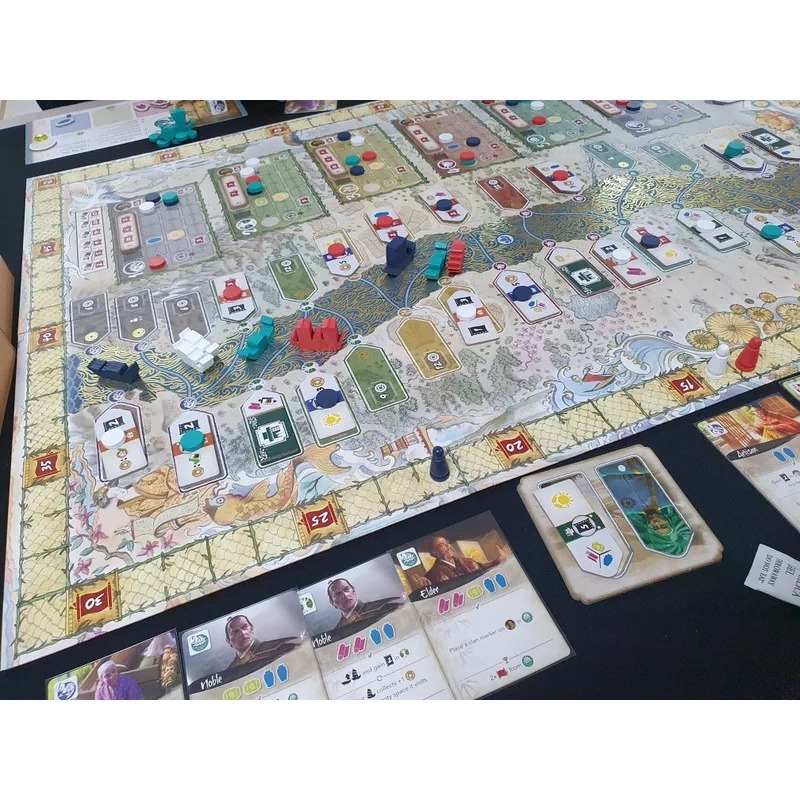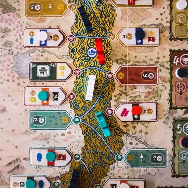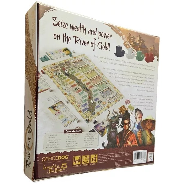 In River of Gold, players take on the role of river merchants allied with legendary samurai clans, each vying to exploit the river to earn wealth, glory, and wisdom. Will you invest in developing ports, markets, shrines, and more along the banks of the busy river? Or will you rely upon sailing the river of gold, growing your wealth and influence through delivery contracts, visiting the nobility, and garnering a bit of divine favor during tough times?