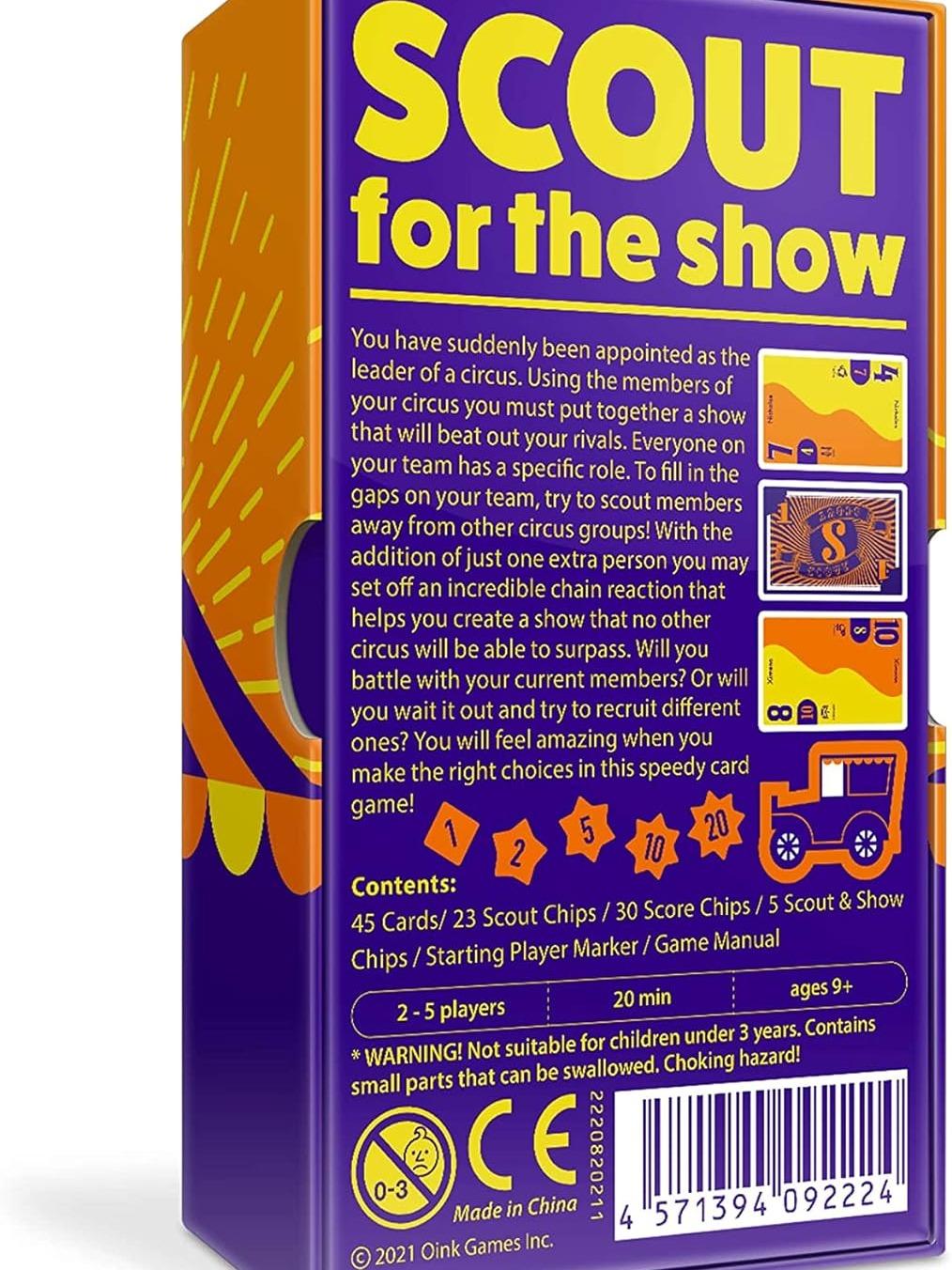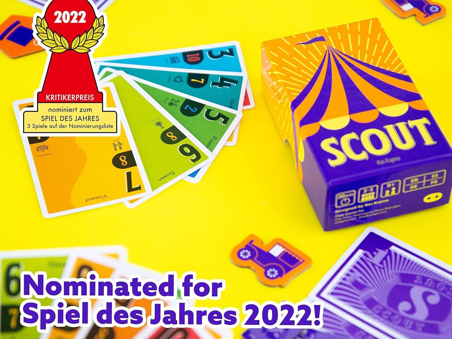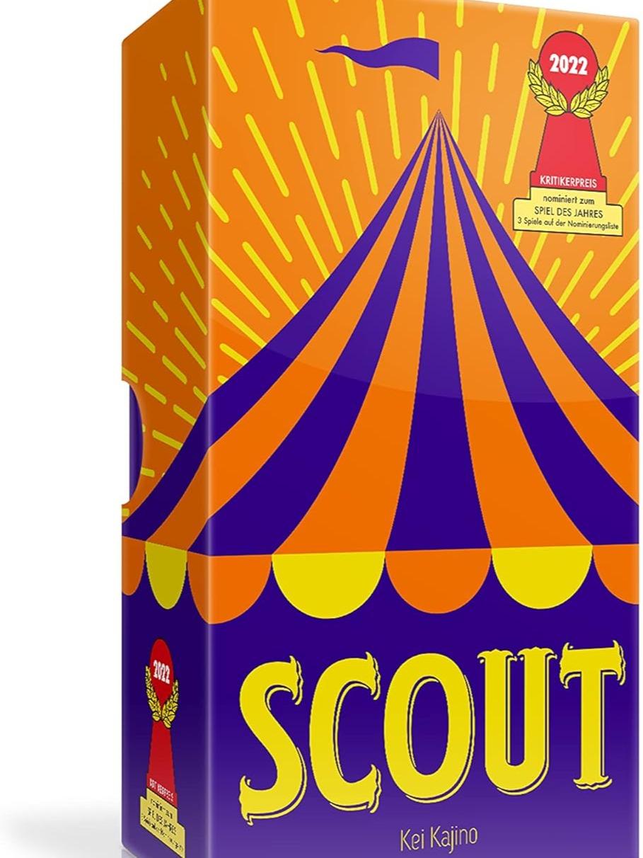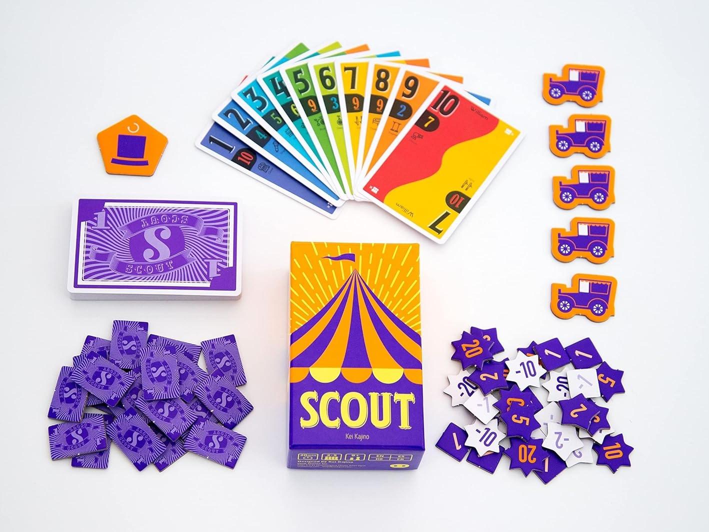 SCOUT is a ladder-climbing game in which cards have two potential values, players may not rearrange their hand of cards, and players may pass their turn to take a card from the current high set of cards into their hand.