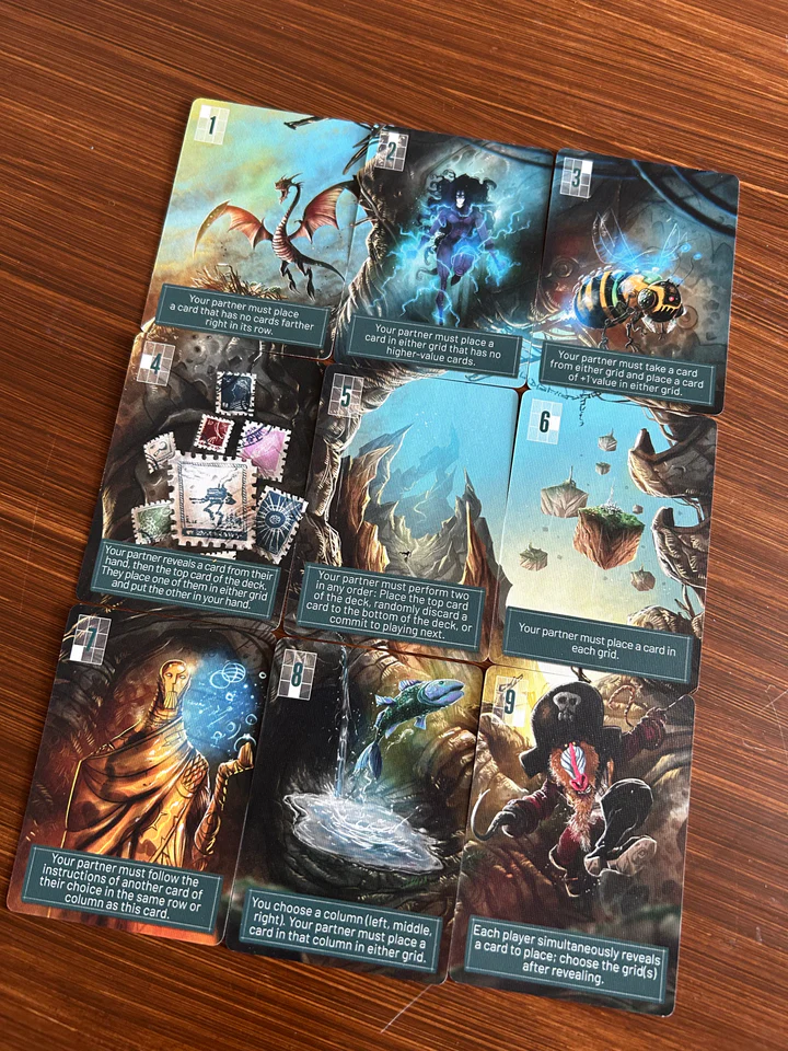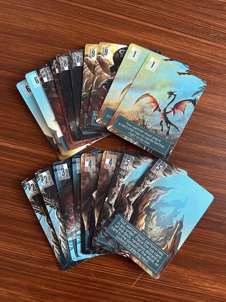 Smitten’s core design was inspired by comic book cards from Jamey’s youth, specifically a set where various cards formed a cohesive 9-card panorama image. In trying to complete two of these images in Smitten, there is no set turn order; rather, players indicate a preference to play or not play a card. The played card has instructions for the other player to place a card, which they must do or the game instantly ends.