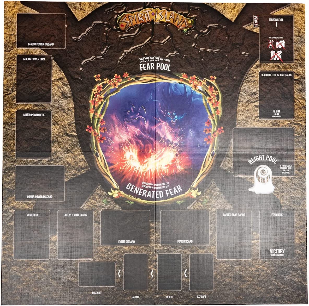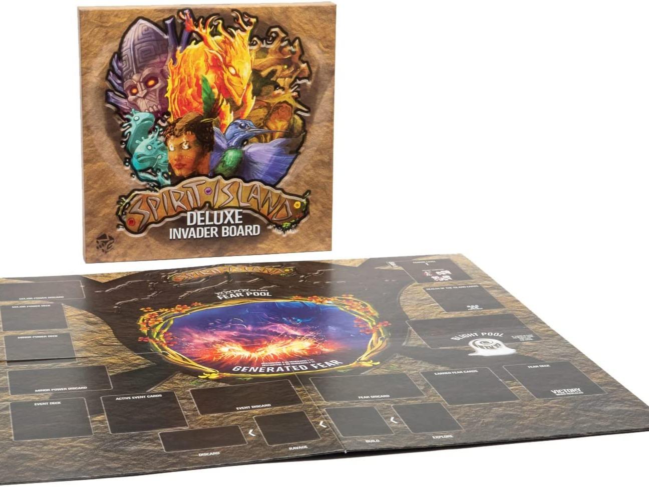 Finally: a home for the decks in your games of Spirit Island! The spirits each have their own boards that provide growth options, presence and energy tracks, innate abilities, and more. The game board is the island itself, with lands full of invaders, Dahan, spirit presence, and other inhabitants and snares. Now, with the Deluxe Invader Board, there is a place for all the rest of the important game elements!