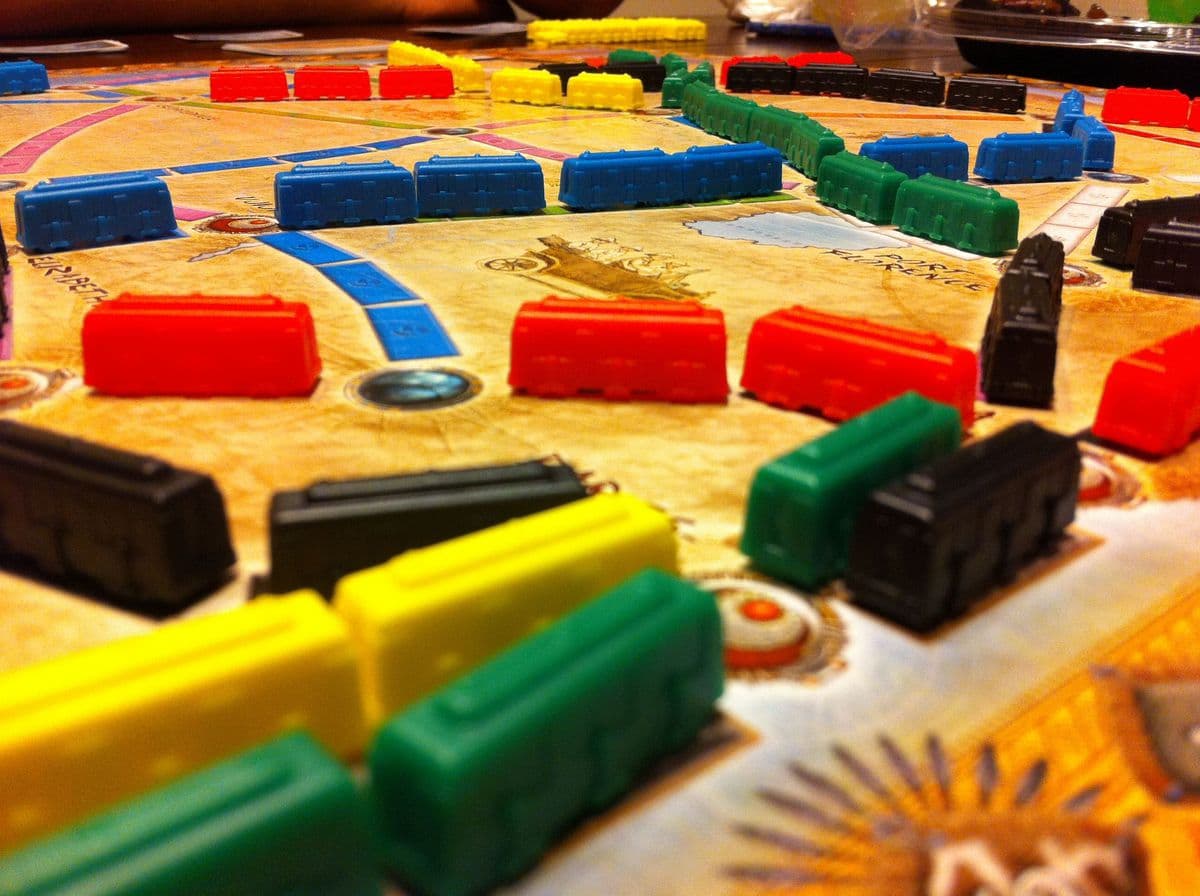 This expansion introduces 45 new terrain cards, divided into three different terrain types. Each type is associated with different route colors: Desert/Savanna cards for yellow, orange and red routes; Jungle/Forest cards for green, blue and purple routes; and Mountain/Cliff cards for black, white and grey routes. Players can draw terrain cards just like train cards and they may use these to double the value of the routes they claim, under certain conditions.