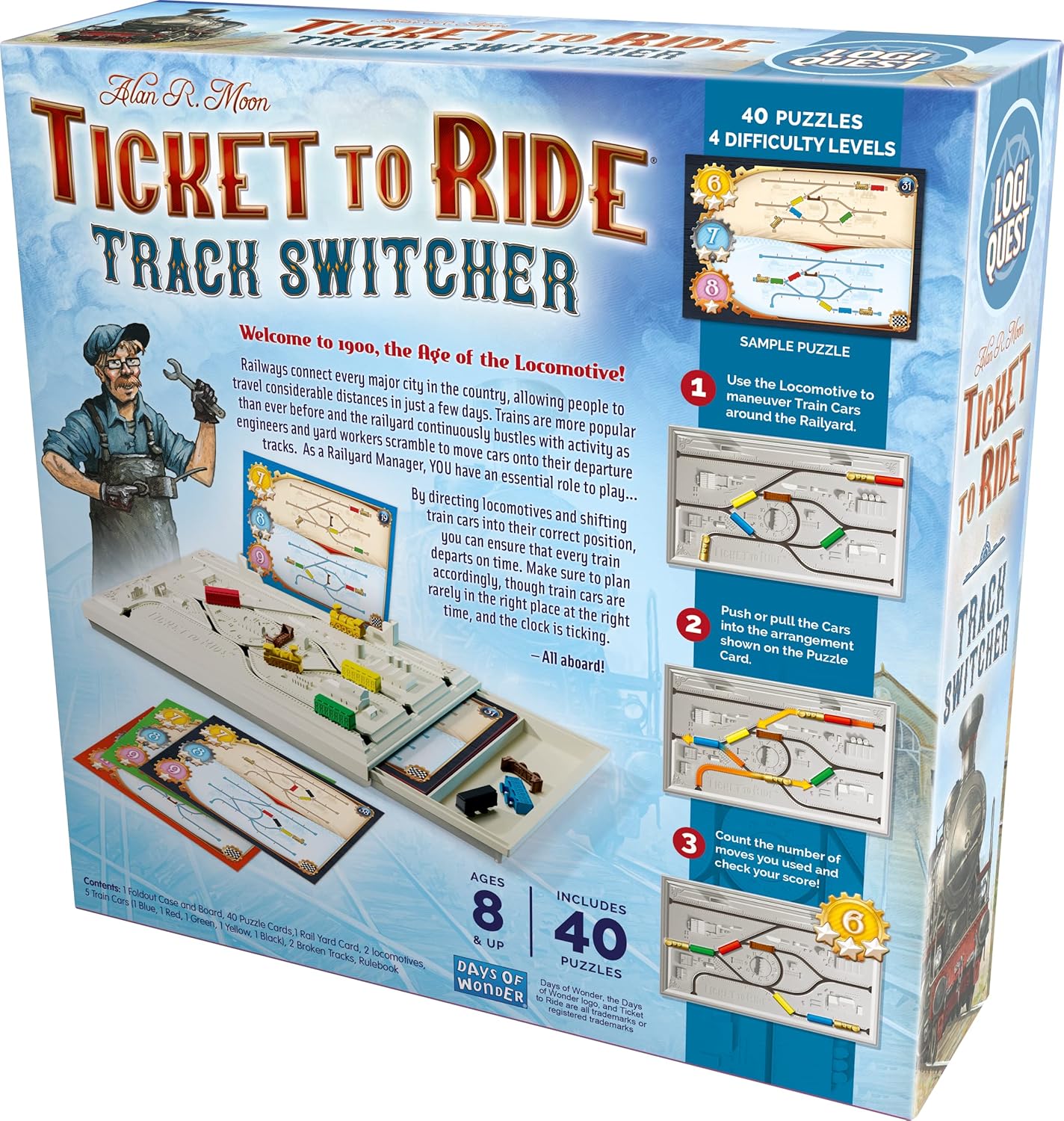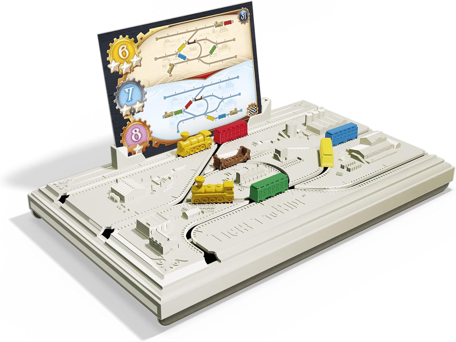 In Ticket to Ride: Track Switcher, players will use cognitive skills like logic, spatial reasoning and sequencing to direct locomotives and shift trains into their correct positions. Players will direct locomotives and shift trains into their correct position based on the puzzle card to ensure every train will leave on schedule. Players will need to be precise: unnecessary moves will make them lose precious time!
