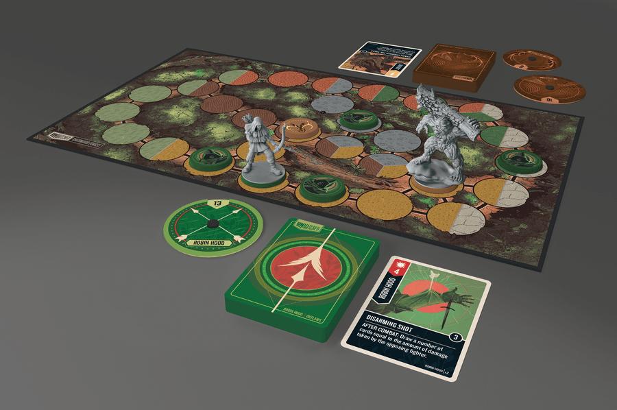 In battle, there are no equals. Unmatched is a highly asymmetrical miniature fighting game for two or four players. (Note that this set is solely for two players, but it can be combined with other sets, which all serve up to four players.) Each hero is represented by a unique deck designed to evoke their style and legend. Tactical movement and no-luck combat resolution create a unique play experience that rewards expertise, but just when you’ve mastered one set, new heroes arrive to provide all new match-ups. Robin Hood vs. Bigfoot features the titular heroes. Robin Hood and his outlaws excel at ranged attacks and robbing from their opponents. Bigfoot and his pal, the Jackalope, crash through the forest for quick attacks before disappearing like a figment of the mind. Combat is resolved quickly by comparing attack and defense cards. However, each card’s unique effects and a simple but deep timing system lead to interesting decisions each time. The game also features an updated version of the line-of-sight system from Tannhauser for ranged attacks and area effects. The game includes a double-sided board with two different battlefields, pre-washed miniatures for each hero, and custom life trackers that’s brought to life with the stunning artwork of Oliver Barrett and the combined design teams of Restoration Games and Mondo Games.