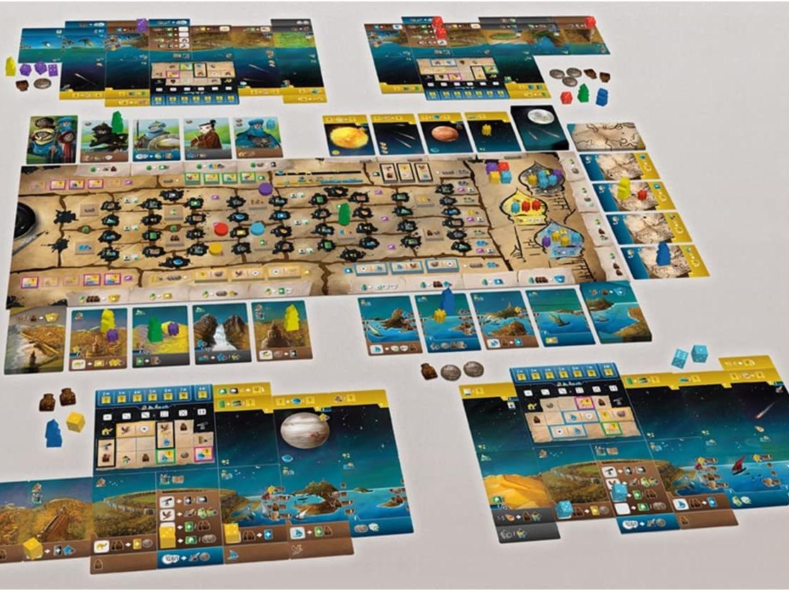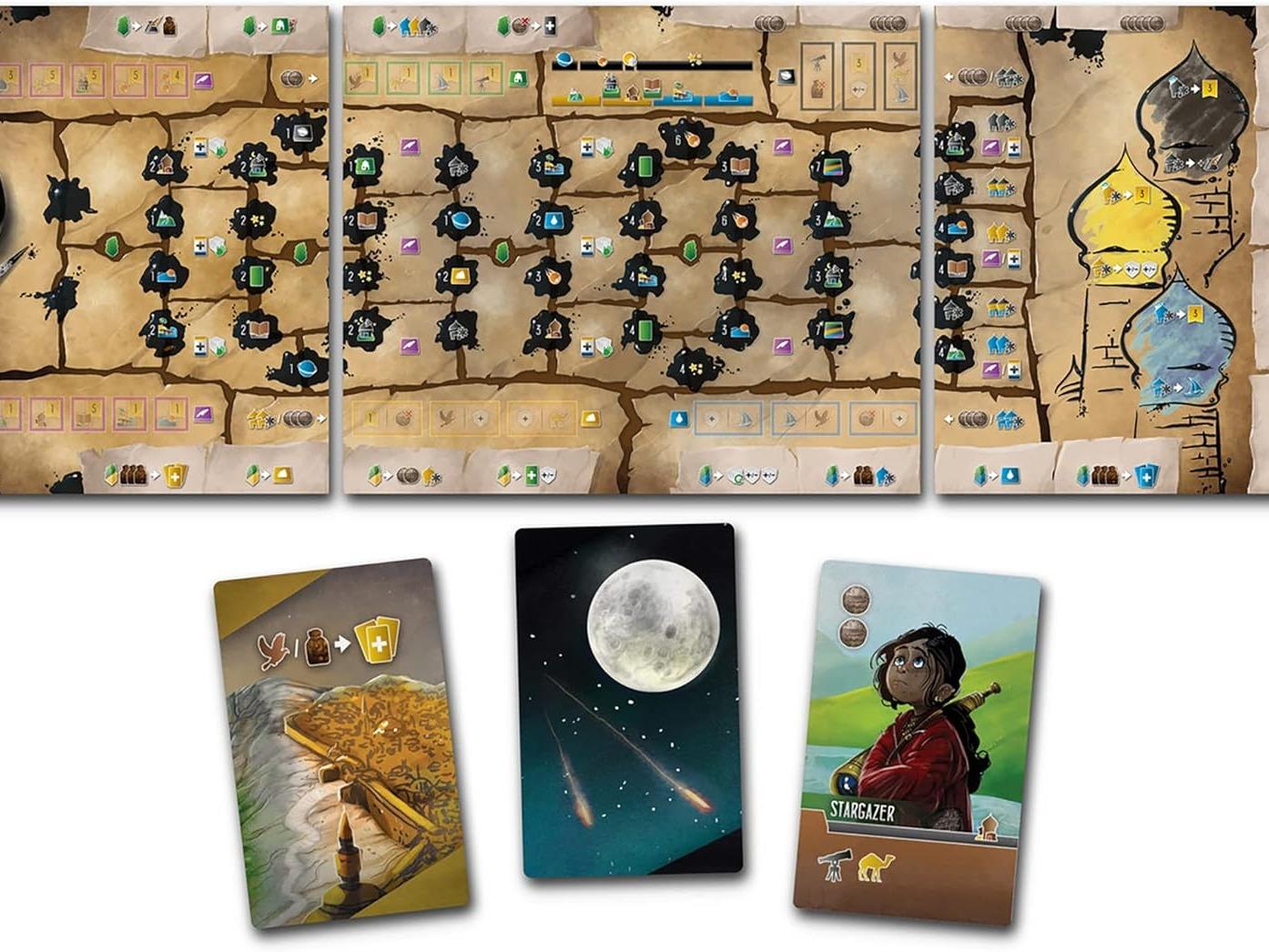Wayfarers of the South Tigris is set during the height of the Abbasid Caliphate, circa 820 AD. As brave explorers, cartographers and astronomers, players set off from Baghdad to map the surrounding land, waterways, and heavens above. Players must carefully manage their caravan of workers and equipment, while reporting back regularly to journal their findings at the House of Wisdom. Will you succeed in impressing the Caliph, or lose your way and succumb to the wilderness? The aim of Wayfarers of the South Tigris is to be the player with the most victory points (VP) at the game’s end. Points are primarily gained by mapping the land, water, and sky. Players can also gain points from upgrading their caravans, by gaining inspiration from nobles, and by influencing the three guilds of science, trade and exploration. As they make discoveries, players will want to quickly journal their progress. The game ends once one player’s marker has reached the far right column of the journal track.